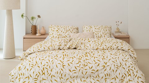 Geef je slaapkamer een rijke uitstraling met dekbedovertrek Golden Shadows van Walra. Het overtrek heeft een natuurlijke print van kaki bladeren die elegant in elkaar overvloeien en een chique look geeft.