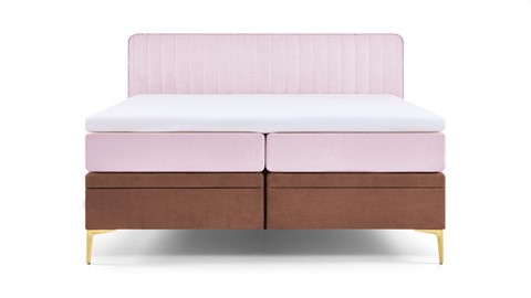 De box is gestoffeerd met stof ‘Regain’. Het hoofdbord en de matrassen zijn gestoffeerd met de stof 'Cape'. De slanke, gouden pootjes Wing maken het design helemaal af.